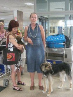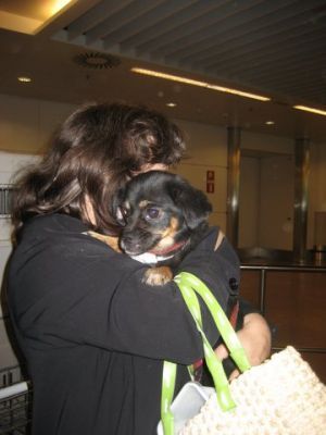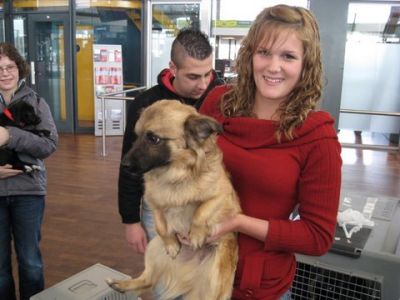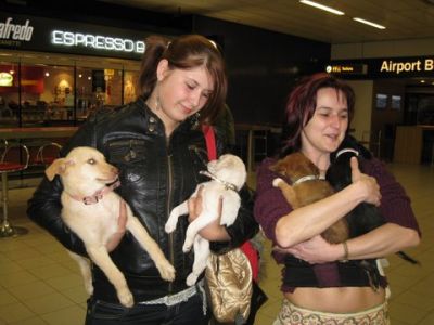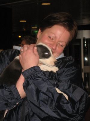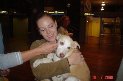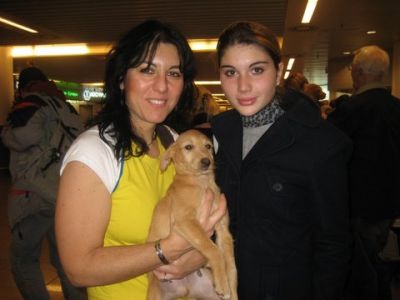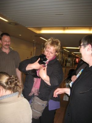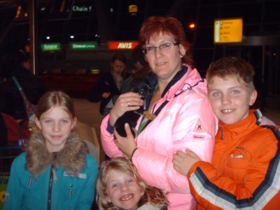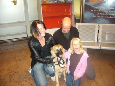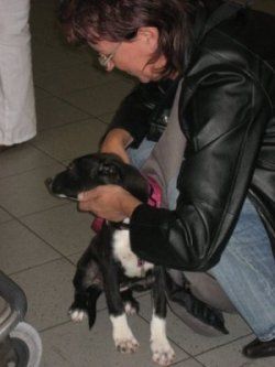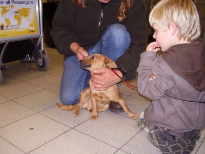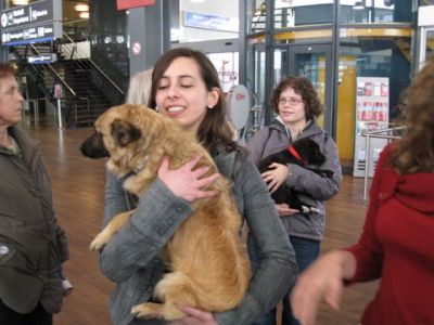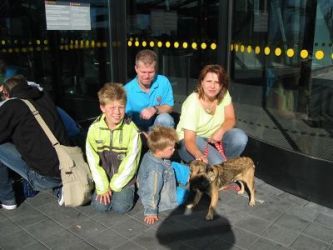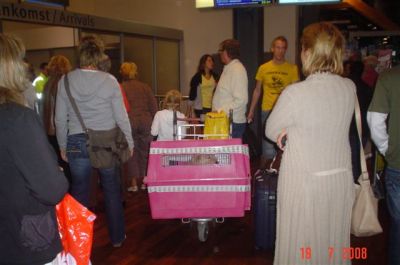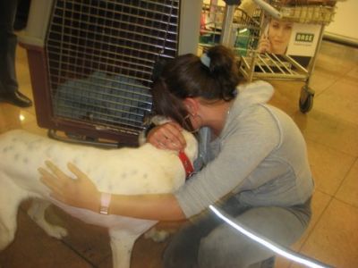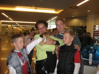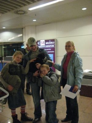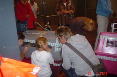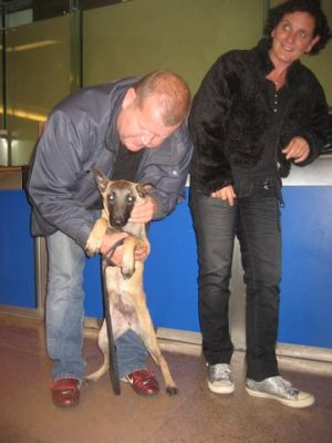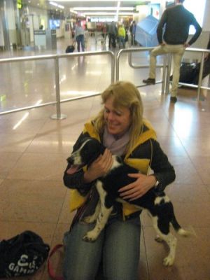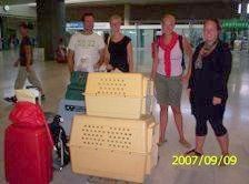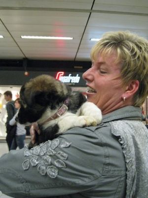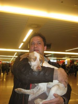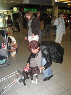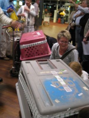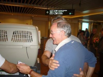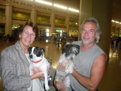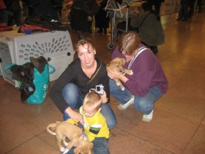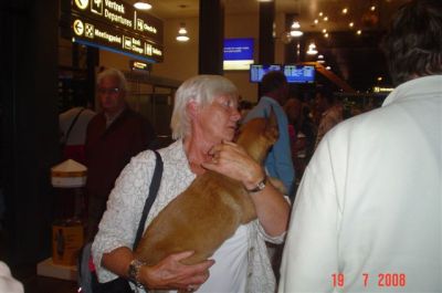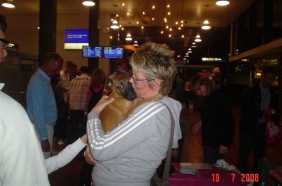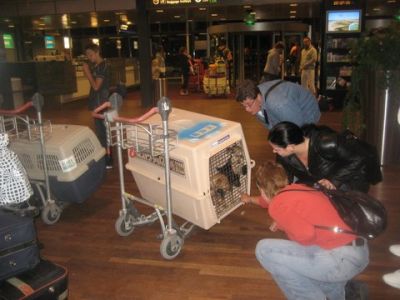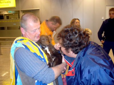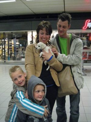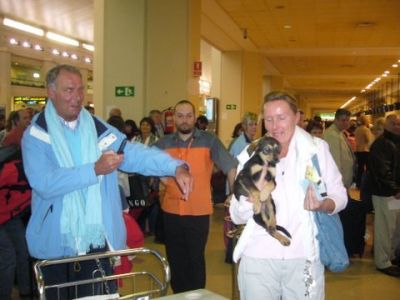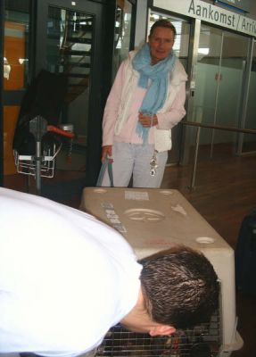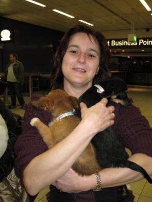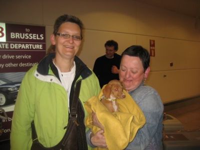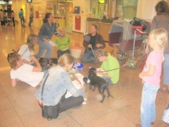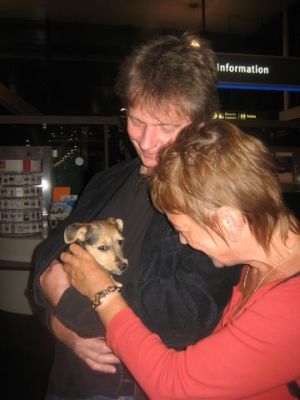 | aankomst 28 juli.. Het vliegtuig had 8 uur vertraging. Er was al een aantal mensen onder weg naar Brussel. Die moesten of weer terug rijden en andere zijn weer gebleven. Maar de lieve adoptie ouders waren allemaal blij dat ze de hondjes in hun armen konden sluiten na zo dag.